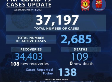 (Eagle News) — Over 100 more COVID-19 cases have been reported among police personnel. According to latest Philippine National Police data, the additional 138 cases pushed the total COVID-19 cases in the police force to 37197. Of these, 2685 are active. Recoveries rose to 34403, including the additional 108 recoveries. No additional COVID-19 deaths were reported, which means the PNP COVID-19 death toll remain at 109. The Philippines on Monday, Sept. 13, reported over 600 […]