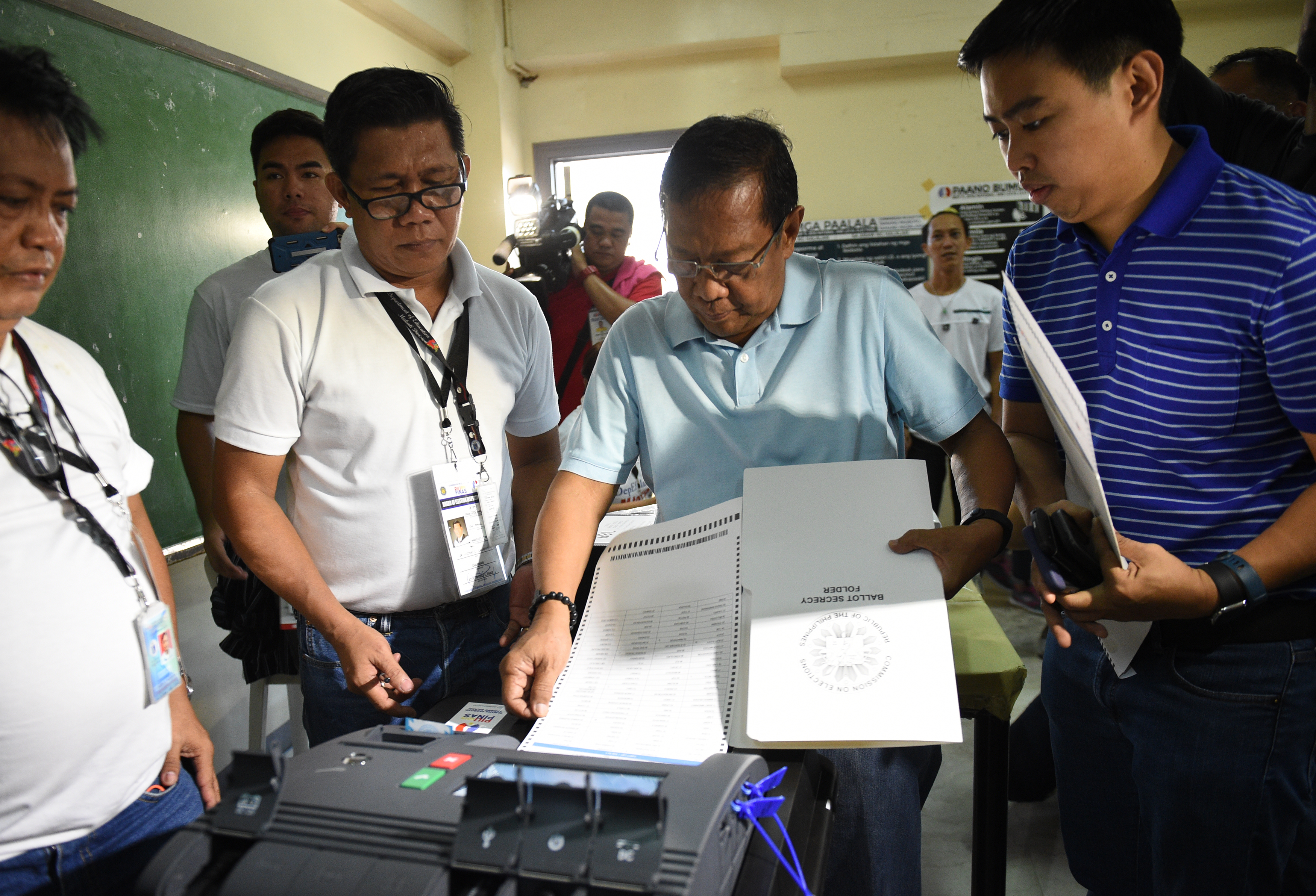 Vice President Jejomar Binay, together with his son former Makati City Mayor Junjun Binay cast their vote in San Antonio National HighSchool in Makati City, Philippines.