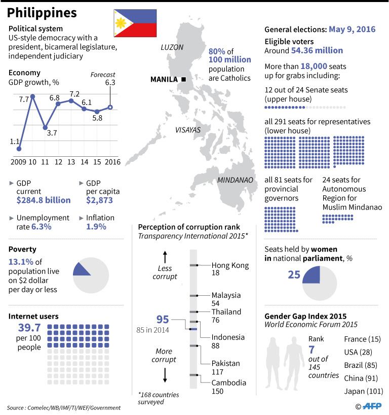 MANILA , Philippines (AFP) — The Philippines holds national elections on Monday, following six years of strong economic growth under President Benigno Aquino who nevertheless has been criticized for failing to fix a devastating rich-poor divide. Below are key facts and figures on the Philippines and its political system: The country and its political system — The Philippines became an independent nation in 1946, following more than 400 years as a colony of either […]