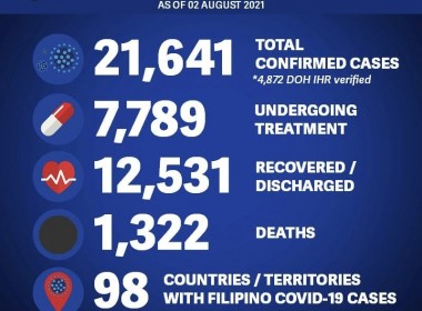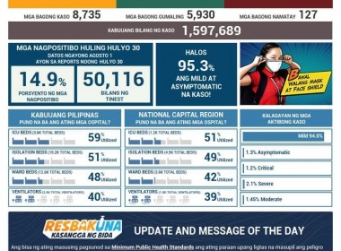 (Eagle News)–COVID-19 cases in the Philippines climbed to 1,588,965 on Saturday, July 31, after the Department of Health reported 8,147 additional cases. The DOH said of the total cases, 60,887 were active. Of these, 93.8 percent were mild, 1.3 percent asymptomatic, 2.1 percent severe, 1.3 percent critical and 1.52 percent were moderate. Recoveries rose to 1,500,189, including the additional 9,117 ones. The death toll is now at 27,889, including the additional 167 deaths. The […]