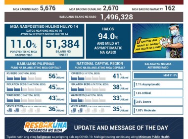 (Eagle News) — COVID-19 cases in the Philippines climbed to 1496328 on Friday, July 16, after the Department of Health reported 5,676 additional cases. According to the DOH, of the total cases, 91.8 percent were mild, 2.1 percent asymptomatic, 1.6 percent critical, 2.6 percent severe, and 1.85 percent were moderate. Recoveries rose to 1421372, including the additional 2670 recoveries. The death toll is now at 26476 including the additional 162 deaths. On Friday, the DOH […]