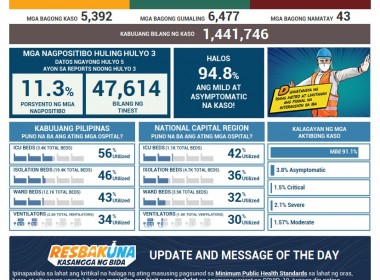 (Eagle News) — COVID-19 cases in the Philippines are now at 1,441,746 after the Department of Health reported 5392 additional cases. The DOH said of the total cases, 51594 were active. Of these, 91.1 percent were mild, 3.8 percent asymptomatic, 1.5 percent critical, 2.1 percent severe, and 1.57 percent were moderate. Recoveries rose to 1364960 including the additional 6477 ones. The death toll is now at 25192 including the additional 43 ones. The Philippines’ COVID-19 […]