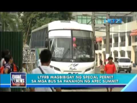 Due to the long vacation which will occur during the APEC Summit, the Land Transportation Franchising and Regulatory Board (LTFRB) will issue special permits for public buses that will travel outside of their authorized routes in order to address the need of commuters. (Eagle News Service Described by Jay Paul Carlos, Video Editing by Jericho Morales, Uploaded by MRFaith Bonalos) https://youtu.be/9OyQLkot1AE