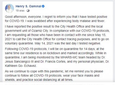 (Eagle News) — Deputy Speaker and Misamis Occidental Rep. Henry Oaminal has tested positive for COVID-19. Oaminal made the announcement in a Facebook post on Monday, May 17. According to Oaminal, the results were based on a test result he took after experiencing body malaise and fever. He said this was despite him being “vigilant – strictly practicing the proper COVID-19 protocols, and meeting only with people who tested negative on the same day.” “However, […]