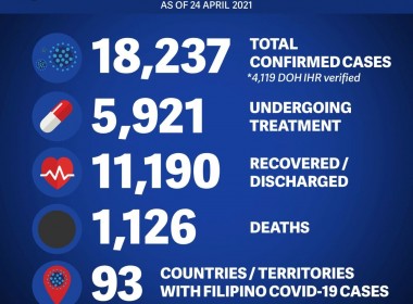 (Eagle News) — The number of COVID-19 cases in the Philippines breached the 997,000 mark on Sunday, April 25, after the Department of Health reported 8162 additional cases. According to DOH data, of the total 997523 cases, 77075 were active. Of these, 96.5 percent were mild, 1.5 percent asymptomatic, 1 percent critical, 1.2 percent severe, and 0.84 percent were moderate. Recoveries rose to 903665, including the additional 20509 ones. Over 100, or 109, more COVID-19 […]