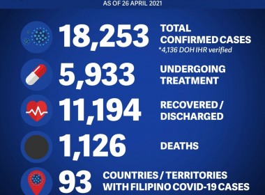 (Eagle News) — Fifteen more overseas Filipinos have tested positive for COVID-19. Recent Department of Foreign Affairs data showed the additional cases pushed the COVID-19 cases among Filipinos abroad to 18237. Nine additional recoveries also pushed the recovery total to 11190. “Compared to last week’s percentages, the total number of COVID-19 recoveries saw a slight decrease to 61.36,” the DFA said. The COVID-19 death toll is now at 1,126, including the three additional deaths among […]