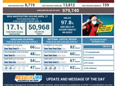 (Eagle News) — COVID-19 cases in the Philippines reached 979,740 on Friday, April 23, after the Department of Health reported 8719 additional cases. According to the DOH, 28 duplicate cases were removed from the total number of cases. Of the total cases, 102799 were active. Of these, 96.4 percent were mild, 1.3 percent asymptomatic, 0.7 percent critical, 0.9 percent severe, and 0.38 percent were moderate. Recoveries climbed to 860,412 with the addition of 13,812 recoveries. […]