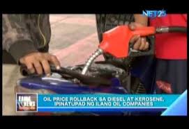 70 centavos per liter of diesel and 65 centavos per liter of kerosene were implemented by Shell, Petron, Phoenix and Seaoil. 25 centavos per liter of gasoline was implemented by Shell while Seaoil and Petron implemented a 30 centavos rollback per liter of gasoline. PTT Philippines implemented a 75 centavos rollback per liter of kerosene and 25 centavos per liter of gasoline. Other oil companies are expected to follow.