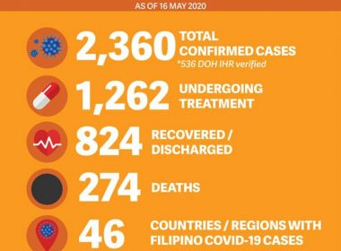 (Eagle News) – The Department of Foreign Affairs (DFA) reported 30 new confirmed COVID-19 cases involving overseas Filipinos, bringing the total number of confirmed cases to 2,360 as of Saturday, May 16. Five (5) new fatalities were recorded, bringing to 274 the total number of COVID-19 related deaths among overseas Filipinos. Thirty five (35) new recoveries were also reported, with the total now at 824. “Today marks the 4th consecutive day of more recoveries than […]