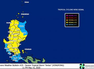 Signal No. 2 hoisted over Babuyan Islands, other areas (Eagle News)–Severe Tropical Storm “Ambo” has weakened further and is now moving over the Northern Bulacan-Southern Nueva Ecija area. The Philippine Atmospheric Geophysical and Astronomical Services Administration said as of 10 p.m., the center of “Ambo” was in the vicinity of San Miguel, Bulacan. “Ambo” is packing maximum sustained winds of 95 kph near the center and gustiness of up to 160 kph, as it moves […]