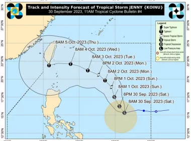 Heavy rainfall possible over Batanes, Babuyan Islands due to TD “Jenny,” PAGASA says (Eagle News)–The low pressure area east of Central Luzon has entered the Philippine Area of Responsibility and has developed into a tropical depression. The Philippine Atmospheric Geophysical and Astronomical Services Administration said now-TD “Jenny” is so far located 1400 kilometers east of southeastern Luzon. It is packing maximum sustained winds of 45 kph near the center, and has a gustiness of up […]