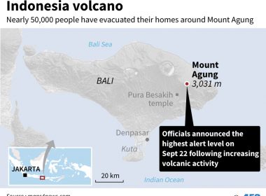 KARANGASEM, India (AFP) — Nearly 50,000 people have evacuated their homes amid fears of an imminent volcanic eruption on the Indonesian resort island of Bali, disaster officials said Monday. Mount Agung, about 75 kilometers (47 miles) from the tourist hub of Kuta, has been rumbling since August, threatening to erupt for the first time in more than 50 years. Indonesia’s disaster mitigation agency said Monday 48,540 people had fled, although the number was expected to rise […]