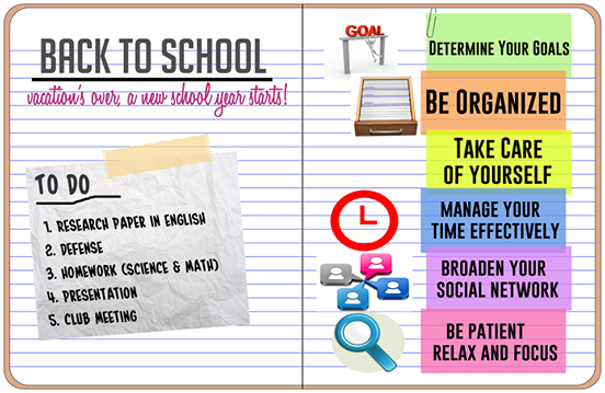 Time to study and prepare for our future Determine your goals Be organized Take care of yourself Manage your time effectively Broaden your social network Be patient, relaxed and focused Have a great school year!
