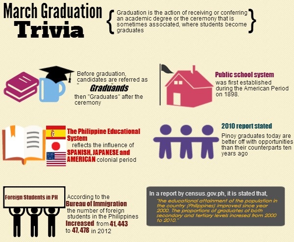 First and foremost, Eagle News PH would like to congratulate all the graduates of batch 2014. You finally did it, with more than 16 years in school, everything was finally paid off. All your hard works and sacrifices has been recognized, and now you are facing the new chapter of your lives. Here is a March Graduation Trivia, composed of ‘Graduation meaning’, ‘Facts about Graduation and Education’ for your information.
