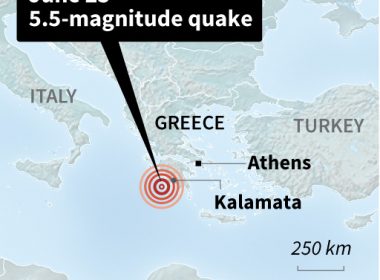 ATHENS, Greece (AFP) — A 5.5-magnitude earthquake struck off the coast of southern Greece on Monday, but there were no immediate reports of damage or casualties. The earthquake hit at a depth of 30 kilometers (19 miles), about 70 kilometers southwest of the city of Kalamata, the US Geological Survey said. The epicenter was in the sea off the town of Pylos. “The quake had a long duration and initially we were worried, but right […]
