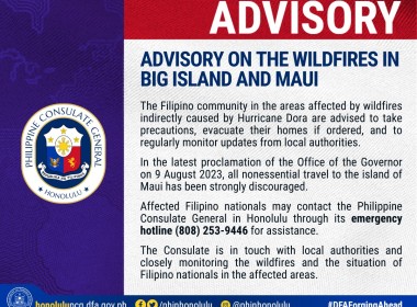 Residents of Filipino descent residing in regions impacted by the Hurricane Dora-sparked wildfires are urged to prioritize safety. Stay vigilant, follow evacuation orders promptly, and stay informed through local updates. A recent declaration from the Office of the Governor, dated August 9, 2023, strongly advises against nonessential travel to Maui Island. For assistance, affected Filipino nationals can reach out to the Philippine Consulate General in Honolulu via the emergency hotline: (808) 253-9446.