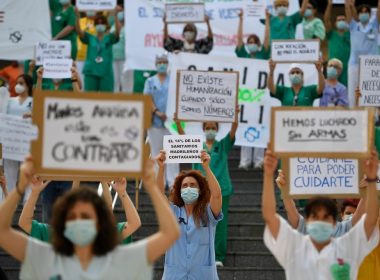 MADRID, Spain (AFP) — Spanish health workers on the front line of the fight against coronavirus gathered on Monday outside hospitals in the Madrid region to rally against shortages of protective equipment. Nurses, doctors and other workers protested in their uniforms, some in scrubs, under the slogan “health workers essential”. They stood silently for two minutes at the gates of several institutions in and around the capital, holding placards and homemade signs that read “we […]