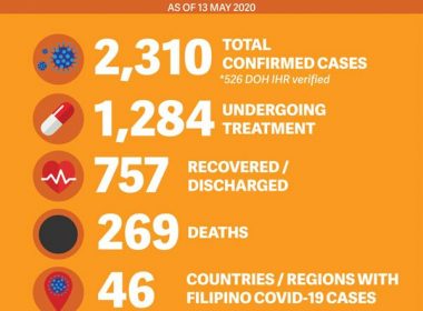 (Eagle News) – The Department of Foreign Affairs (DFA) reported 77 new confirmed COVID-19 cases involving overseas Filipinos, bringing the total number of confirmed cases to 2,310 as of Wednesday, May 13. The Department also reported 8 new deaths, bringing the total number of COVID-19 related fatalities to 269. Seventy seven (77) new recoveries were also recorded, mostly in the Asia and Pacific and Europe regions, with the total now at 757. “[T]he daily rate […]