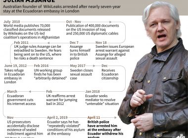 by Dario THUBURN Agence France Presse LONDON, United Kingdom (AFP) — WikiLeaks founder Julian Assange’s nearly seven-year hideout in Ecuador’s London embassy abruptly ended Thursday when police entered the building and arrested him ahead of possible extradition to the United States. Footage shot by the Russian video news agency Ruptly showed a frantic-looking Assange — his worn face framed by a large white beard and shock of grey hair — being huddled out of […]