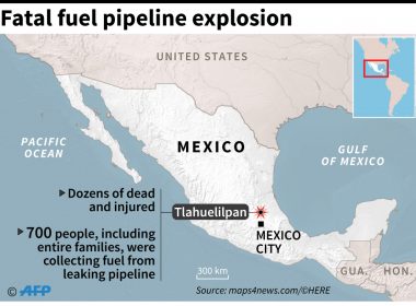 MEXICO CITY, Mexico (AFP) — The death toll from a fiery pipeline explosion in central Mexico reached 107 Thursday, the government announced, with 40 people also injured in the blast last week. Last Friday, the fuel-line in Hidalgo state was deliberately punctured, drawing hundreds of people looking to gather gasoline before it ignited. The disaster occurred as the government wages a huge effort to clamp down on fuel theft, which costs Mexico an estimated $3 […]