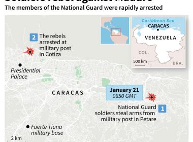 by Maria Isabel SANCHEZ Agence France Presse CARACAS, Venezuela (AFP) — A group of 27 soldiers rose up against Venezuela’s President Nicolas Maduro at a command post in Caracas on Monday, but were quickly arrested after posting an appeal for public support in a video, the government said. “We are the professional troop of the National Guard against the regime, which we completely repudiate. I need your help, take to the streets,” a man who […]