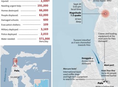 by Andrew Beatty Agence France Presse PALU, Indonesia (AFP) — More than a thousand people could still be missing after Indonesia’s devastating quake-tsunami, officials said Friday, drastically upping the number of people unaccounted for a week after the disaster. Palu city on Sulawesi island has been left in ruins after it was hit by a powerful quake and a wall of water which flattened houses and flipped over cars, with the official death toll […]