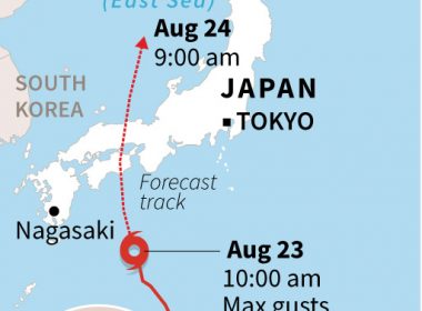 TOKYO, Japan (AFP) — A strong typhoon hurtled towards western Japan on Thursday, with forecasters warning of heavy rains and landslides, including in areas hit by deadly flooding last month. Typhoon Cimaron, with maximum gusts of 216 kilometres (133 miles) per hour, was around 280 kilometres southeast of the Goto islands at 2300 GMT Wednesday, the Japan Meteorological Agency said. The typhoon is expected to make landfall late Thursday and head north through Friday morning, […]