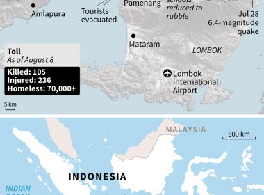 MATARAM, Indonesia (AFP) — More than 70,000 people have been left homeless in the deadly earthquake that hit Lombok island, forced to sleep in makeshift shelters and lacking food, medicine and clean water, authorities said Wednesday. The shallow 6.9-magnitude quake killed at least 105 people and triggered panic among locals and tourists on Lombok on Sunday, just a week after another tremor surged through the holiday island and killed 17. Some 236 people have been […]