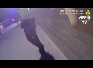 Dramatic police body cam footage shows harrowing moments during the October 1, 2017 mass shooting on the Las Vegas strip, which left at least 59 people dead and more than 500 wounded. The video showed a police man and his unit sheltering behind a wall near the Mandalay Bay hotel. He can also be heard asking others to take shelter. (Agence France Presse TV video sourced from Las Vegas Police Department)