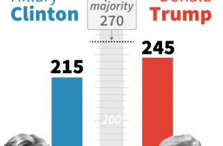 WASHINGTON, United States (AFP) — As of roughly 0530 GMT Wednesday, Republican Donald Trump had earned 245 of the 270 electoral college votes he needs to secure the US presidency, according to network projections. His Democratic rival Hillary Clinton had earned 215 electoral votes. Candidates are racing to hit the magic number of 270 electoral votes, which reprsents an absolute majority of the 538 members of the electoral college, with the number from each state based […]
