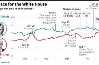 by Michael Mathes LEEBURG, United States (AFP) — Five campaign stops in five states in a single frenzied day. An FBI bombshell announcement. Painful delays. And supporters both jittery and exuberant about Election Day, desperate to hear from their outsider hero. Republican Donald Trump careened into the final 48 hours of a toxic and bruising US presidential campaign Sunday, shifting into overdrive his effort to flip Democratic states as he battles Hillary Clinton for the […]