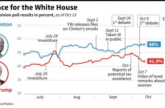 WASHINGTON, United States (AFP) — Donald Trump fired off an erratic new broadside at Hillary Clinton on Sunday, making more explosive claims that American media and a conspiracy to commit voter fraud are rigging the presidential election against him. Amid the latest Twitter blasts from the Republican White House nominee, his running mate Mike Pence sought to lower tensions by insisting his camp would accept defeat if that’s what voters decide on November 8. Two […]