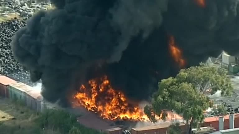 Australian fire crews tackle fire burning through 150,000 tyres at tyre yard