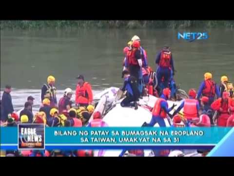 In Taiwan, 31 were reported dead when an airplane fell down a river.