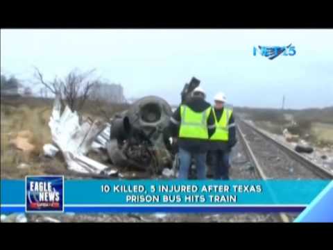 At least 10 people have died while five others were injured when a prison bus in Texas hits a train due to veering off an icy overpass.
