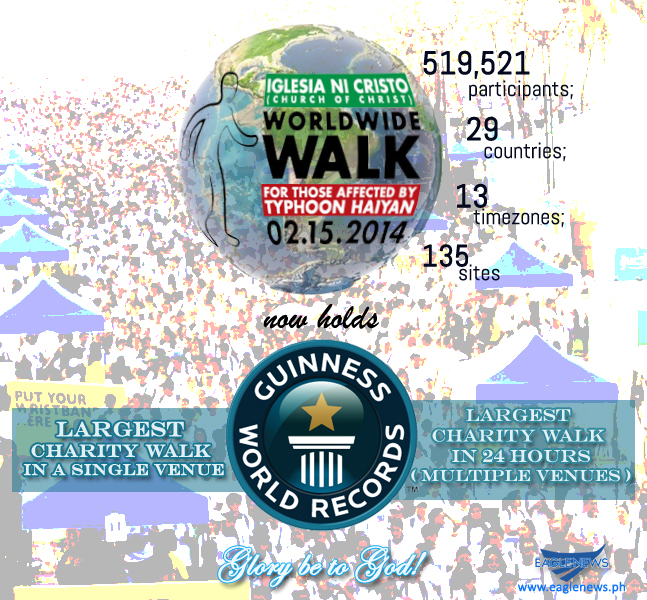 MANILA, Philippines — “Congratulations! You are now officially amazing, again!” With this declaration, Guinness world records official adjudicator Kirsty Bennett announced Sunday, February 16, that the Iglesia Ni Cristo now had set two new world records for its “Worldwide Walk” for Yolanda survivors held on Saturday, February 15, coinciding with the 100th day since the super typhoon struck Central Philippines. The first Guinness record set on February 15 was for the largest charity walk in a […]