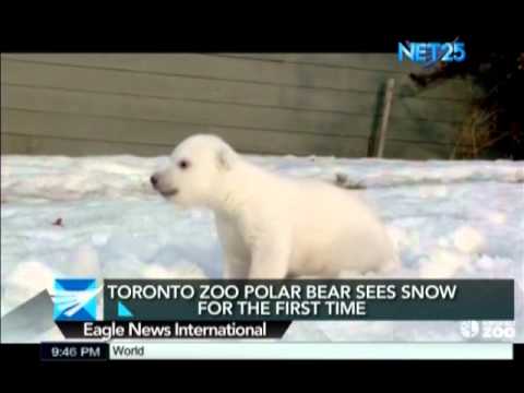 A 12-week old polar bear cub born in the Toronto Zoo is introduced to snow for the first time.