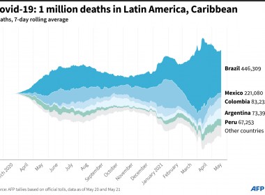 MONTEVIDEO, Uruguay (AFP) — More than one million people have died of Covid-19 in Latin America and the Caribbean since the pandemic began, according to an AFP count based on official figures as of Friday at 2105 GMT. The region has also recorded more than 31.5 million infections. More than 90 percent of deaths have been registered in five countries that account for 70 percent of the region’s population: Brazil (446,309 dead), Mexico (221,080), Colombia […]