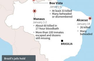 by Johannes MYBURGH Agence France-Presse NATAL, Brazil (AFP) – Brazil’s government Tuesday ordered the armed forces to help secure the country’s overcrowded jails as police fought to separate rival gangs of inmates in one prison following a massacre. Inmates climbed on the roof and set up barriers of furniture in a northeastern jail inhabited by warring rival drug gangs vowing to behead each other. Police fired rubber bullets to try to keep apart two rival […]