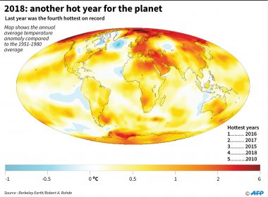 WASHINGTON, United States (AFP) — The last four years have been the world’s hottest since record-keeping began, with 2018 the fourth warmest on record, according to data published Thursday by US research group Berkeley Earth. Temperatures in 2018 were around 1.16 degrees Celsius (2.09 degrees Fahrenheit) above the average temperature of the second half of the 19th century, from 1850-1900, often used as a pre-industrial baseline for global temperature targets. “Global mean temperature in 2018 […]
