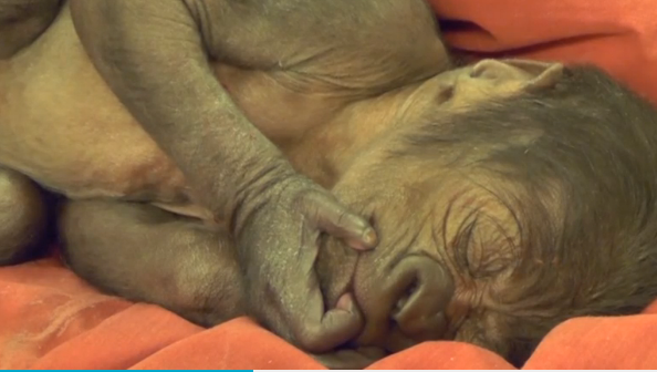 Rare Caesarian-born baby gorilla taken out to enclosure for the first time.