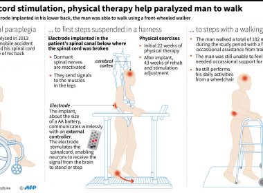 by Patrick Galey Agence France Presse PARIS, France (AFP) — Five years after he was paralyzed in a snowmobile accident, a man in the US has learned to walk again aided by an electrical implant, in a potential breakthrough for spinal injury sufferers. A team of doctors at the Mayo Clinic in Minnesota say the man, using a front-wheeled walker, was able to cover the equivalent of the length of a football pitch, issuing […]