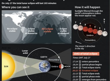 by Mariette le Roux and Pascale Mollard Agence France-Presse The longest “blood moon” eclipse this century will coincide with Mars’ closest approach in 15 years to offer skygazers a thrilling astronomical double bill on Friday, astronomers say. For about half the world, the moon will be partly or fully in Earth’s shadow from 1714 to 2328 GMT — six hours and 14 minutes in all. The period of complete eclipse — known as “totality”, when […]
