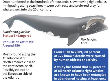 by Marlowe HOOD Agence France-Presse PARIS, France (AFP) — When an endangered female North Atlantic right whale spends months, even years, disentangling itself from cast-off fishing nets, there’s not much energy left over for mating and nursing calves. Coping with such debris, along with ship collisions and other forms of human encroachment, have severely stymied recovery of the majestic sea mammals long after explosive harpoons and factory ships nearly wiped them out, according to a […]