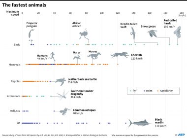 by Marlowe Hood Agence France Presse PARIS, France (AFP) — It’s not quite E=mc2, but scientists unveiled Monday a simple, powerful formula that explains why some animals run, fly and swim faster than all others. Call it the “speed rule”: strength alone does not determine top velocity because land mammals, birds and fish can only accelerate for as long as they can draw from available energy stored in muscle tissue. An intermediate body size — […]