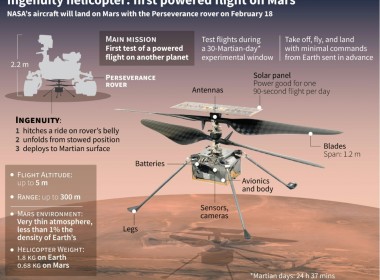 WASHINGTON, United States (AFP) — More than a century after the first powered flight on Earth, NASA intends to prove it’s possible to replicate the feat on another world. Transported aboard the Mars 2020 spacecraft that arrives at the Red Planet on Thursday, the small Ingenuity helicopter will have several challenges to overcome — the biggest being the rarefied Martian atmosphere, which is just one percent the density of Earth’s. – Ultralight – It might […]