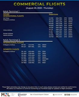 (Eagle News)--The Manila International Airport Authority has released its list of operational commercial flights for Thursday, Aug. 20: Flight schedules…