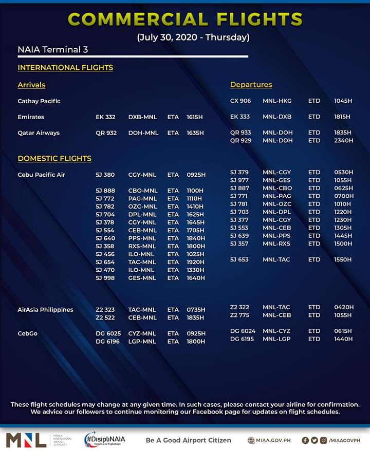 (Eagle News)--The Manila International Airport Authority has released its list of operational commercial flights for Thursday, July 30: Flight…