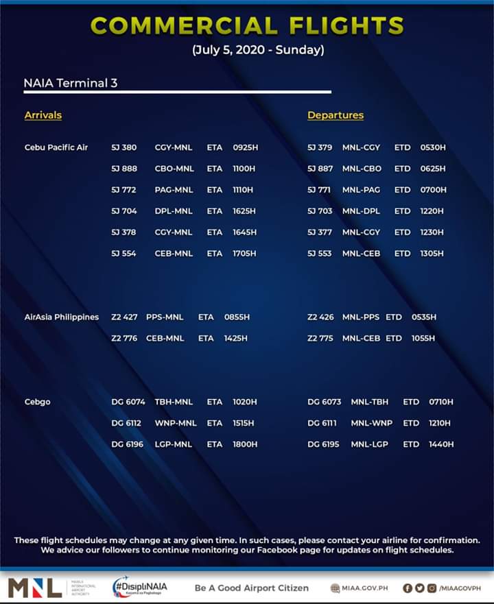 (Eagle News)--The Manila International Airport Authority has released its list of operational commercial flights for Sunday, July 5. Flight schedules…
