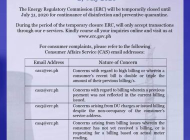 (Eagle News)–The Energy Regulatory Commission is temporarily closed for disinfection until July 31. In an advisory, the ERC said during the temporary closure, it will only accept transactions online. “Kindly course all your inquiries online and visit us at www.erc.gov.ph,” the ERC said. The commission said consumers may direct their complaints to the following email addresses: “We encourage consumers to use the email addresses that we have set up to receive specific consumer concerns and […]